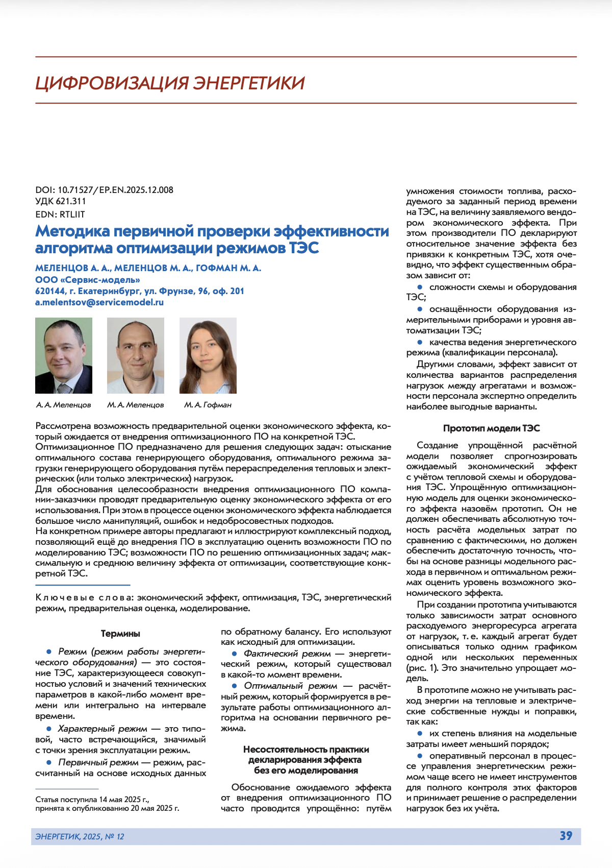 В номере 12 журнала «Энергетик» за 2025-й год опубликована статья «Методика первичной проверки эффективности алгоритма оптимизации режимов ТЭС» (авторы Меленцов М.А., Меленцов А.А., Гофман М. А.)