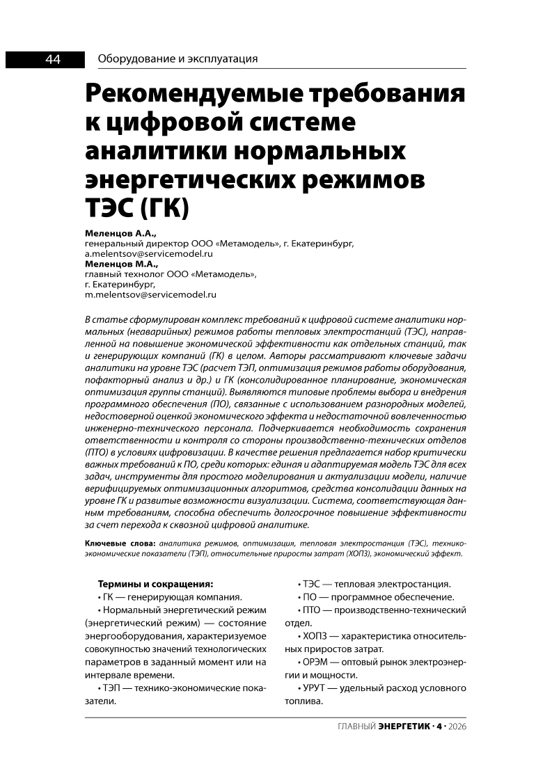 В номере 4 журнала «Главный энергетик» за 2026-й год опубликована статья «Рекомендуемые требования к цифровой системе аналитики нормальных энергетических режимов ТЭС (ГК)» (авторы Меленцов М.А., Меленцов А.А.)